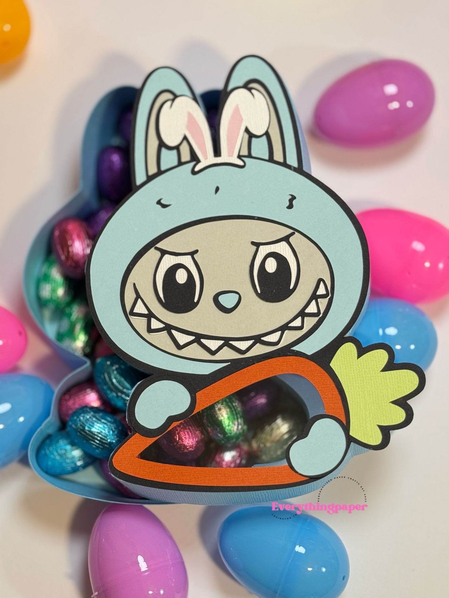 Archivo digital para recortar y armar caja en forma de Labubu pascua